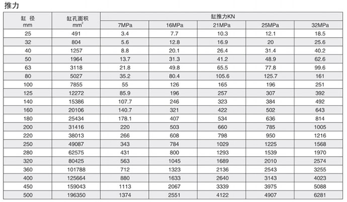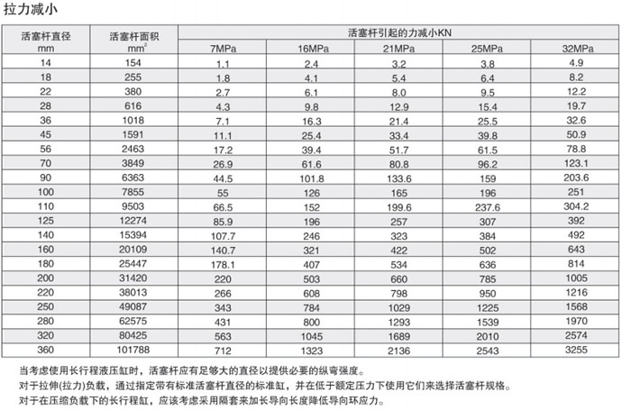 如果活塞杆受拉,则使用拉力减小表:按上述用于推用途的程序;使用下面的拉力减小表,根据所选的活塞杆径和压力确定所指示的力;从原来的推力中扣出此力,所得到的数值为可用来移动负载的净力。