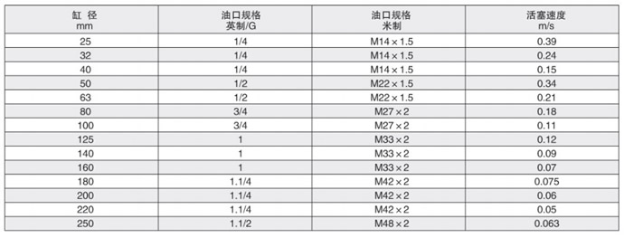 影响液压星空app登录入口-星空(中国)速度的因素之一是引入或排出油口连接管路中的油液流量。连接管路中的油液流速应限制与5m/s,以便把油液紊流、压力损失和液压冲击减至最小。下表数据为油液流速5m/s时的活塞速度。如果超过此范围请加大油口规格和连接管路。